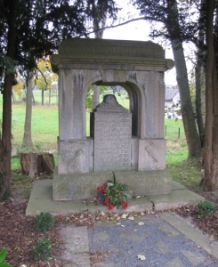 Triumphbogen. Darunter ein Quader, der mit einem Stahlhelm abgeschlossen wird. Auf dem Quader sind die Namen und Sterbedaten