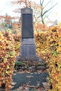 Stele mit eingelassener Metallplatte für den Ersten Weltkrieg. Zusätzlich wurde eine Tafel mit den Namen der Gefallenen des Zweiten Weltkriegs angebracht.