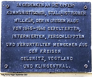 eine Gedenktafel für die Opfer stalinistischer Willkür in Oelsnitz (Vogtland). Der Keller des Gebäudes Am