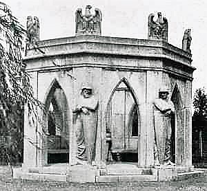 Ehemaliges Denkmal für die Gefallenen des 1. Weltkriegs: Sechseckiges Denkmal mit sechs Adlerfiguren oberhalb der Ecken, Torbögen und zwei Soldatenfiguren am Eingangsbogen. Innen Gedenktafel mit 169 Namen (abgerissen).