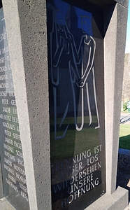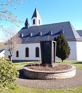 Neben der Kirche St. Brictius inmitten einer Wiese ein Steinrondell, darauf inmitten von Rosenstöcken eine vierseitige Steinsäule. Auf jeder Seite schwarze Steinplatten: Inschrift (darüber stilisiertes Paar), Gefallene 1914-1918, 1939-1945 Gefallene, Vermisste sowie Gestorbene durch Kriegseinwirkung; oben aufgesetzt ein offenes Schwarzes Kreuz, in dessen Inneren ein stilisierter Stahlhelm.