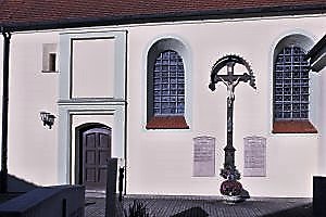 An der Außenseite der Kirche St. Helena befindet sich ein Kreuz, an dessen Fuß sind versetzt zwei Gedenktafeln befestigt.