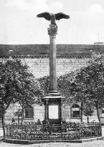 Denkmal für die Gefallenen des Krieges 1870/71: Abgestufter und verzierter Quader mit aufgesetzter klassischer Säule und krönendem Adler (abgerissen).