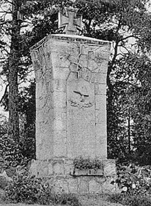 Denkmal für die Gefallenen des 1. Weltkriegs: Nach unten verjüngte breite Stele aus Natursteinen mit eingelassener Widmungs- und Namenstafel und Stahlhelm-Relief, gekrönt von einem EK-Zeichen (entwidmet, Ruine erhalten).