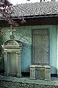 Im Friedhof; Gedenktafel aussen am Geräteschuppen