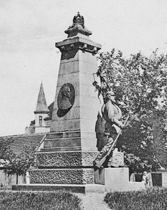 Denkmal für die Gefallenen des Krieges 1870/71: Breiter abgestufter Obelisk mit krönender Kaiserkrone. Davor das Standbild eines Soldaten mit Gewehr und Pickelhaube. Am Obelisken Plaketten mit Portraits (abgerissen).