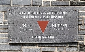 Denkmal-Nr.: 09301239 Am Treppenaufgang zum oberen Bahnhof von Plauen ist eine steinerne Tafel für den Eisenbahner Paul Dittmann angebracht. Er nutzte seine berufliche Tätigkeit als Zugführer auf der Linie Plauen-Eger (Cheb), um illegales Schriftmaterial nach Deutschland zu bringen. Er wurde verhaftet und musste vier Jahre in der Haftanstalt Bautzen verbringen. Schwer erkrankt entlassen, verstarb er bald danach. Auf der Tafel, die mit einem roten Winkel als Symbol für die »Opfer des Faschismus« gestaltet ist, wurde eine entsprechende Inschrift angebracht.