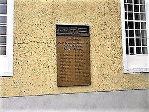 Im Bereich der Kirche befinden sich die Gedenkplätze für die Gefallenen beider Weltkriege. An der äußeren Kirchwand hängt eine Holzplatte mit den Namen der Gefallenen des Zweiten Weltkriegs. Vor dem Haupteingang der Kirche steht ein Steinquader, 1,5 m hoch, bekrönt von einem Stahlhelm. An der Vorderseite steht die Widmung, an beiden Seiten die Namen der Gefallenen.