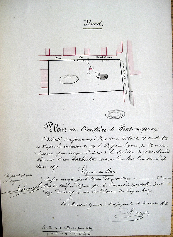 Bearbeitet gemäß dem Gesetz vom 4. April 1873 und der Verordnung des Präfekts des [Departements] Yonne vom 22. Oktober des nachfolgenden Jahres über die Angabe des Platzes für das Grab des deutschen Soldaten Bernard Henri Terhechte, beigesetzt am dortigen Friedhof am 4. März 1871.