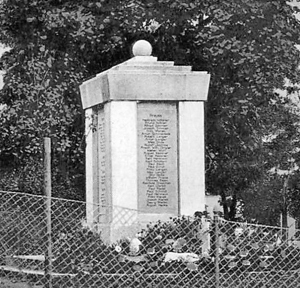 Denkmal für die Gefallenen des 1. Weltkriegs: Quader mit eingelassenen Widmungs- und Namenstafeln, großem Deckstein und krönender Kugel (abgerissen).