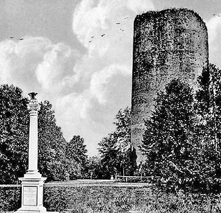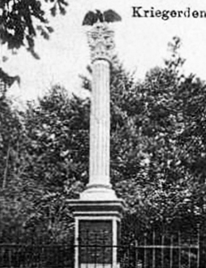 Denkmal für die Gefallenen des Krieges 1870/71 am sogenannten Hungerturm: Abgestufter Quader mit eingelassenen Widmungs- und Namenstafeln, darauf eine klassische Säule mit krönendem Adler (abgerissen).