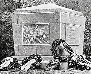 Denkmal für die Gefallenen im 1. Weltkrieg der in Leipzig stationierten sächsischen Fuß-Artillerie-Regimenter Nr. 12 und 19: Unten verjüngter Quader aus Steinblöcken mit eingelassener Widmungstafel und Reliefs, die Szenen aus dem Kriegshandwerk zeigen. Dach flach spitz zulaufend mit umlaufender Inschrift. (Denkmal komplett abgerissen)