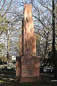 Denkmal für die Gefallenen im 1. Weltkrieg des in Leipzig stationierten Infanterie-Regiments Nr. 416: Hohe abgestufte Stele aus rotem Sandstein, Schwertmotiv vorn und Relief eines nackten Kriegers auf der Rückseite. (Denkmal erhalten)
