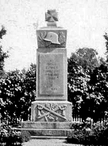 Denkmal für die Gefallenen des 1. Weltkriegs: Abgestufte viereckige Stele mit Reliefs von gekreuzten Schwertern mit Eichenlaub unten und Stahlhelm oben, gekrönt von einem EK-Zeichen (abgerissen).
