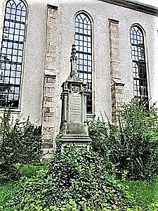 Vor der Kirche im Stadtteil Rabenstein steht ein Obelisk für die Gefallenen des Deutsch-Französischen Krieges. Der untere Anteil ist verwittert und efeubewachsen. Auch der obere Anteil ist nur bedingt lesbar.