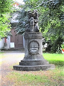 Vor der Kirche steht ein ca. 2 m hohes rundes Denkmal (in Form einer Litfaßsäule), oben die Figur eines knienden Kriegers, vorne ein Eichenlaubkranz mit der Inschrift. Sonst ist von den originalen Beschriftungen nichts mehr erkennbar. An der Rückseite befindet sich eine kleine - neuzeitlich angebrachte - Messingtafel mit den Namen der Gefallenen. Davor steht noch ein kleiner Stein zur Erinnerung an 1813.