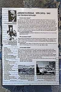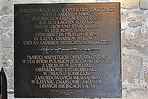 Tafel in der "Folterkammer" Dem Gedenken aller Opfer des Stalinismus unter anderem 14.500 polnischen Kriegsgefangenen aus den Lagern Kosjelsk, Ostaschkov und Starobjelsk in der Sowjetunion, ermordet im Frühjahr 1940 in Katyn, Charkov, Myednoye und an anderen Hinrichtungsstätten.