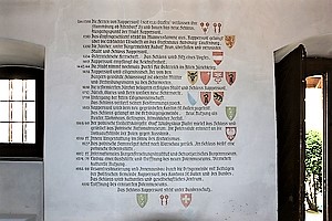 Geschichte des Schlosses Um 1200 Die Herren von Rapperwil (seit 1235 Grafen) verlassen ihre Stammburg ob Altendorf Sz. und bauten das neue Schloss. Ausgangspunkt der Stadt Rapperswil 1283 Das Grafengeschlecht stirbt im Mannesstamme aus. Rapperswil gelangt über die Erbtochter Elisabeth an das Grafenhaus Habsburg-Laufenburg. … 1442/44 Die Stadt nimmt nochmals Partei für Österreich im Alten Zurichkrieg. … 1868/69 Der polnische Freiheitskämpfer Graf Wladyslaw Plater mietet das Schloss und gründet das Polnische Nationalmuseum. Die Polensäule erinnert an die Volksaufstände der Polen gegen Russland. … 1927 Das polnische Sammelgut kehrt nach Warschau zurück. Im Schloss bleibt eine polnische Gedenkstätte … 1990 Eröffnung des erneuerten Polenmuseum