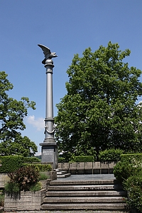 Säule in der Nähe vom Schlosseingang; runde Säule, oben mit Adler, am viereckigem Unterteil Inschriften Hier in Rapperswil fanden die Polen Schutz vor Verfolgung und Sklaverei.