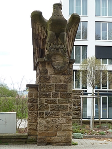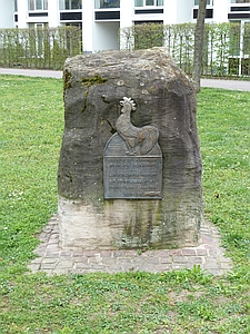 Rastatt (Gedenkstein französische Besatzung), Landkreis Rastatt, Baden-WürttembergPLZ 76437 Grünanlage an der Ludwigsfeste. Gedenkstein an das Ende der französischen Garnison 1999. Daneben Relikt der ehemaligen Wehrmachtskaserne mit herausgemeißeltem Symbol aus der nationalsozialistischen Zeit.
