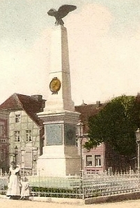 Denkmal für die Gefallenen des Krieges 1870/71 auf dem Marktplatz: Abgestufter Obelisk mit Inschriften und EK-Zeichen im unteren Bereich und krönender Adlerfigur.