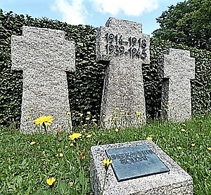 Soldatengräber auf dem Rehauer Friedhof. Drei große Steinkreuze markieren das Grabfeld. Davor liegen neunundzwanzig kleine Steinquader, auf denen jeweils eine Metalltafel mit dem Namen des Gefallenen angebracht ist. Weiter Gedenkinschriften finden sich auf diversen Grabsteinen.