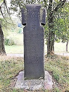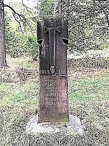 Gedenkstele mit Kopfende in Form eines Eisernen Kreuzes sowie Schwert und lateinischem Kreuz als Symbolgestaltung inklusive Namenstafel, aufgestellt oberhalb des Alten Schulwegs in Rehefeld
