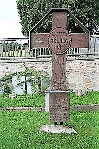 Überdachtes christliches Kreuz aus Holz auf dem Kirchhof der ev.-luth. Dorfkirche