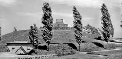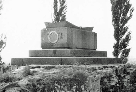 Denkmals-Anlage für die Gefallenen des 1. Weltkriegs an einem großen Hügel: Unten einer Mauer mit abgestuftem Dach und einer dreieckigen Fläche mit Inschrift. Oben ein Sarkophag mit weiterer Inschrift (abgerissen).