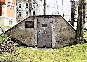 Denkmal-Nr.: 09245904 Einer der wenigen erhaltenen Luftschutzbunker von großer historischer Bedeutung. Gangsystem mit zwei Einstiegen, Beton mit Eisentüren, Stahlbetonummantelung, tonnengewölbt, Sockel der Sitzbänke erhalten, errichtet im Zusammenhang mit Einrichtung eines Lazaretts in der gegenüberliegenden Schule, Bunker war für gehfähige Lazarettpatienten und Zivilbevölkerung. An einem Einstieg befindet sich eine Erinnerungstafel mit Inschrift. Der Luftschutzbunker wurde während des Zweiten Weltkrieges (nach 1942) durch polnische Fremdarbeiter errichtet (vermutlich für zirka 200 Personen). In Reichenbach Tieffliegerangriff am 21. März 1945 und Artilleriebeschuss.