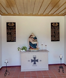 Kriegergedächtniskapelle (im Friedhof) mit einem kleinen Altar, dessen Vorderseite mit einem Eisernen Kreuz, beschriftet mit den Jahreszahlen 1914 u. 1918 sowie Krieg – Frieden, bemalt ist. Auf zwei schwarzen Tafeln, links und rechts des Altares an der Wand, stehen die Namen der Gefallenen und Vermissten des Ersten Weltkrieges nach Jahr ihres Todes geordnet.