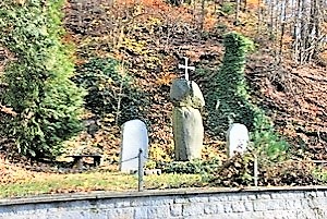 Standort Talstraße. Hier hochkant stehender rundlicher 2 Meter großer Findlingsstein, oben auf ein kleinerer ca. 40 cm hoher Stein mit Metallkreuz und Inschrift als Denkmal für die Opfer des Ersten Weltkriegs. Daneben stehen zwei helle polierte Granitsteine für den Zweiten Weltkrieg.