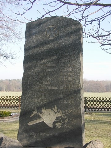 Gedenkstein mit Eisernem Kreuz und den Namen der Gefallenen des Ersten Weltkriegs.