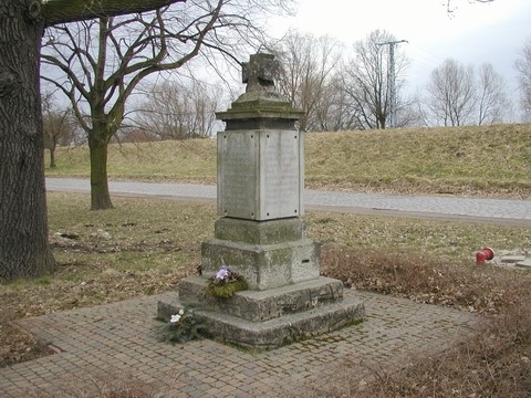 Stele in der Ortsmitte, eine Seite mit Widmung, die anderen drei Seiten mit den Gefallenennamen.
