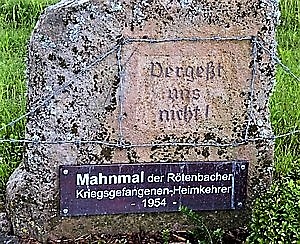 Rötenbach (Spätheimkehrer), Gemeinde Friedenweiler, Landkreis Breisgau-Hochschwarzwald, Baden-WürttembergPLZ 79877 Denkmal für kriegsgefangene Spätheimkehrer. Naturstein mit Inschrift und angebrachter Metalltafel.
