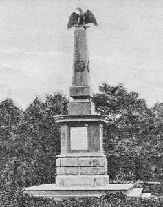 Denkmal für die Gefallenen des Krieges 1870/71: Abgestufter Unterbau mit eingelassenen Widmungs- und Namenstafeln, darauf ein Obelisk mit Plaketten von Kaiser Wilhelm I. und anderen Persönlichkeiten sowie krönendem Adler mit Schwert in den Fängen (abgerissen).