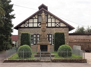 Das Denkmal steht gegenüber dem Dorfplatz an der Hauptstraße. Auf einem gemauerten Sockel ist ein Pfeiler mit leicht abgeschrägten Seiten aufgesetzt. Den oberen Abschluss bildet eine Frauenfigur (evtl. eine Germania oder Bavaria) mit Krone und Schild. An der Vorderseite des Sockels ist eine schwarze Steintafel mit Namensliste angebracht und in den anderen Seiten jeweils mittig ein Löwenkopf. Die Vorderseite des Pfeilers zieren zwei Reliefs. An den unteren Enden der anderen drei Seitenflächen befindet sich jeweils eine Inschriftenkartusche mit der Darstellung eines Eisernen Kreuzes in einer halbkreisförmigen Ausstülpung. Durch Verwitterung des Sandsteins ist die Inschrift auf der Rückseite nur noch teilweise lesbar.