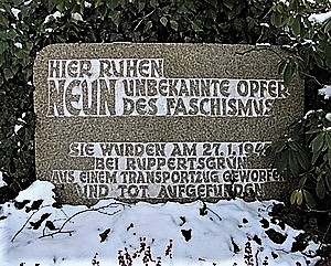 HIER RUHEN NEUN UNBEKANNTE OPFER DES FASCHISMUS SIE WURDEN AM 27. 1. 1945 BEI RUPPERTSGRÜN AUS EINEM TRANSPORTZUG GEWORFEN UND TOT AUFGEFUNDEN
