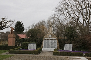 Im Friedhof: gemauerte Steinpyramide, oben mit Engel, davor und seitlich Gedenktafeln. Links davon das alte Denkmal aus rotem Sandstein, oben mit knieendem Soldaten. Zusätzlich Namen von privaten Gedenksteinen.