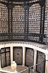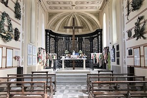 Tafel 1 Restaurierung der Kapelle des Ossarims durchgeführt auf Initiative von Lions Clubs. Aus Anlass des 140-jährigen Gedenktages an die Schlacht von San Martino und Solferino wollte Lions von vier Nationen hiermit Zeugnis ablegen von ihrem Willen zum Frieden auf der Welt. (Text auch in italienisch, ungarisch und tschechisch) Lions Clubs Desenzano Lago (I) Wiener Neustadt (A) Wörthersee (A) Sopron (H) Brno Spilberk (CZ)