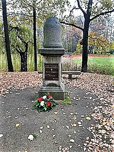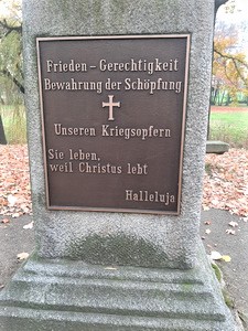 Im Park des kath. Bischof-Benno-Hauses steht auf einer zentralen Erhebung eine Steinstele mit vier Metallplatten mit den Namen der Gefallenen beider Weltkriege.