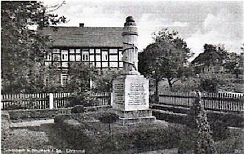 Denkmal-Nr.: 09209871 Die Aufnahme zeigt das Ehrenmal der Ortschaft Schönbach, das am 31. August 1921 seine Weihe erlebte. Es ist eine Arbeit des Reichenbachers Otto Heilmann. Die Schale ersetzt den ursprünglichen Stahlhelm, der sich einst als Abschluss obenauf befunden hat. (Fehlhauer). Auf dem Sockel standen ursprünglich die Namen der Gefallenen. Darüber erhebt sich eine Säule, die die gebündelten Stäbe des Zusammenhalts darstellen sollen. Die anderen ursprünglichen Inschriften sind ebenfalls verschwunden. Statt dessen wurde eine Tafel mit allgemeiner Mahnung auf den Sockel vor die Säule gesetzt.