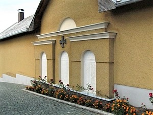 Denkmal-Nr.: 09234398 An einer Mauer vor dem Rathaus angebrachtes Denkmal für die Gefallenen des Ersten Weltkrieges: Zwei Wandvorlagen unter dem Dachgiebel mit aufgelegten Profilierungen, drei Wandnischen mit halbkreisförmigem oberen Abschluss, in den Nischen gusseiserne Platten mit Widmung, Namen und Sterbedaten der Gefallenen in der Reihenfolge der Sterbedaten, über der mittleren Nische für die Gesamtheit ein stilisiertes Eisernes Verdienstkreuz. Denkmal für die Gefallenen des Zweiten Weltkrieges: Drei Meter rechts neben dem Denkmal für die Gefallenen des Ersten Weltkrieges an der Wand eine zirka ein Meter breite und zwei Meter hohe Eisengussplatte mit halbkreisförmigem oberen Abschluss mit erhabener Inschrift.