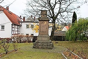 Vor der Kirche/Friedhof steht das Denkmal: Ein roter Obelisk auf Feldsteinsockel. Obenauf ein Steinquadrat, an allen vier