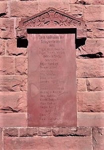 Die Gedenktafeln aus rotem Sandstein für die Teilnehmer der Feldzüge 1866 und 1870/71 sind links und rechts des
