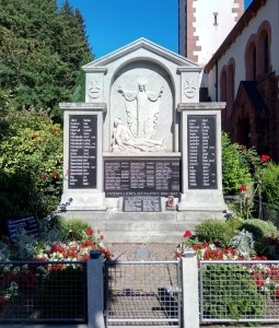 Das Denkmal für die Gefallenen und Vermissten beider Weltkriege steht links von der Kirche. Unter der Darstellung Jesu,