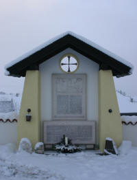 Neben der Kirche: Gedenktafeln in Form eines Altars, oben Steinrelief; zusätzlich Hinweise zu Soldaten von privaten Gedenksteinen.