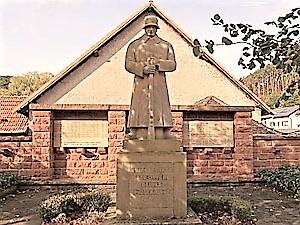 An einer Sandsteinmauer in der Hauptstraße zwei Steinplatten mit den Namen. Davor ein Soldat auf einem Sockel, der