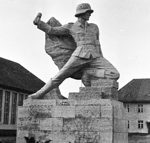 Denkmal am Eingang der Kasernenanlage des Truppenübungsplatzes Stablack: Quader ohne Inschriften mit großer Figur eines knienden Soldaten mit Stahlhelm, Handgranate und Fahne (abgerissen).