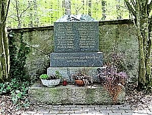 Kriegerdenkmal auf dem Friedhof. Gedenkstein auf einem Stufenpodest an der Friedhofsmauer.